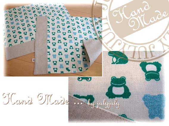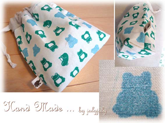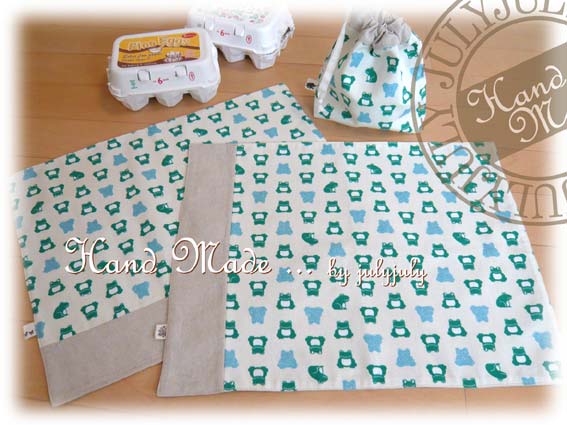 コットンリネン(綿麻)のカエル柄のランチョンマット2枚と巾着の3点セットです。