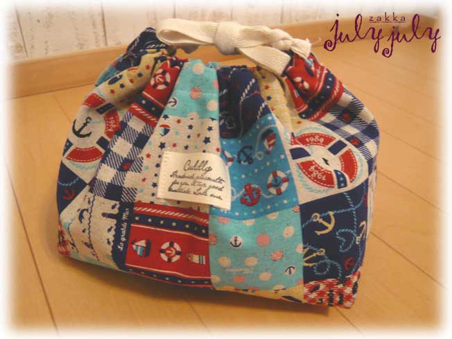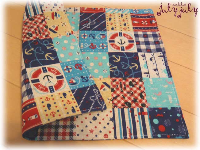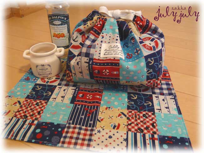 コットンリネン(綿麻)のマリン柄のランチョンマットと巾着のセットです。