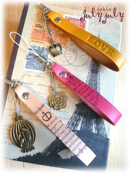 「名入れカシメストラップ」や「アンティーク柄ストラップ」に付けるだけで